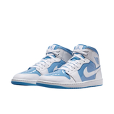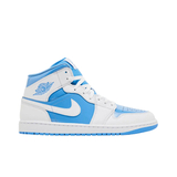 Кроссовки Air Jordan 1 Mid "Legend Blue" демонстрируют культовую расцветку UNC (Университет Северной Каролины), сочетая снежно-белый и ярко-голубой цвета. Их верх выполнен из блестящей лакированной кожи, что придает кроссовкам элегантный и отполированный вид. Чистая белая основа идеально контрастирует с фирменными накладками цвета "Legend Blue" на свуше (логотип Nike), носке и воротнике. Добавляют привлекательности и логотипы: Air Jordan Wings заметно расположен на воротнике, а логотип Jumpman завершает образ на язычке.