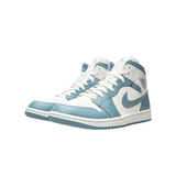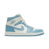 Черпая вдохновение в оригинальных Air Jordan 1 High UNC, женские Jordan 1 Mid UNC (W) имеют верх из белой кожи с накладками и логотипами Swoosh цвета University Blue. На воротнике расположен логотип Air Jordan Wings, отсылающий к истокам этого силуэта. В основании подошва Air в тон завершает дизайн.