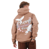 Эта худи — больше, чем просто одежда. Это манифест, призывающий к самовыражению и любви к себе. Крупный принт с изображением голубей и надписью «Love yourself first» на спине вдохновляет и выделяет из толпы. Свободный крой и мягкий, теплый материал делают худи идеальным выбором для долгих прогулок или расслабленного отдыха. Небольшое изображение голубя и логотип на груди завершают этот продуманный дизайн.
