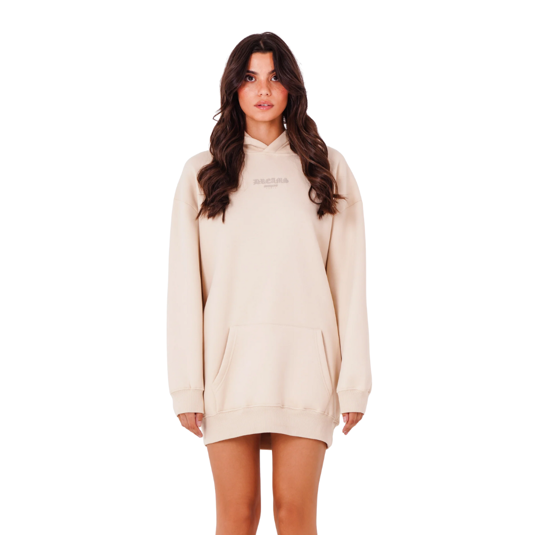 Создайте непринужденный, но загадочный образ с этим худи-платьем, в котором сочетается комфорт и символизм. На спине платья — уникальный принт, включающий изображения змей, солнца и символа инь-янь, что делает его по-настоящему особенным. Надпись «dreams» на передней части дополняет общую концепцию, а плотная ткань и удобный карман-кенгуру обеспечивают тепло и уют. Это идеальное решение для тех, кто хочет совместить уличный стиль с женственной элегантностью.