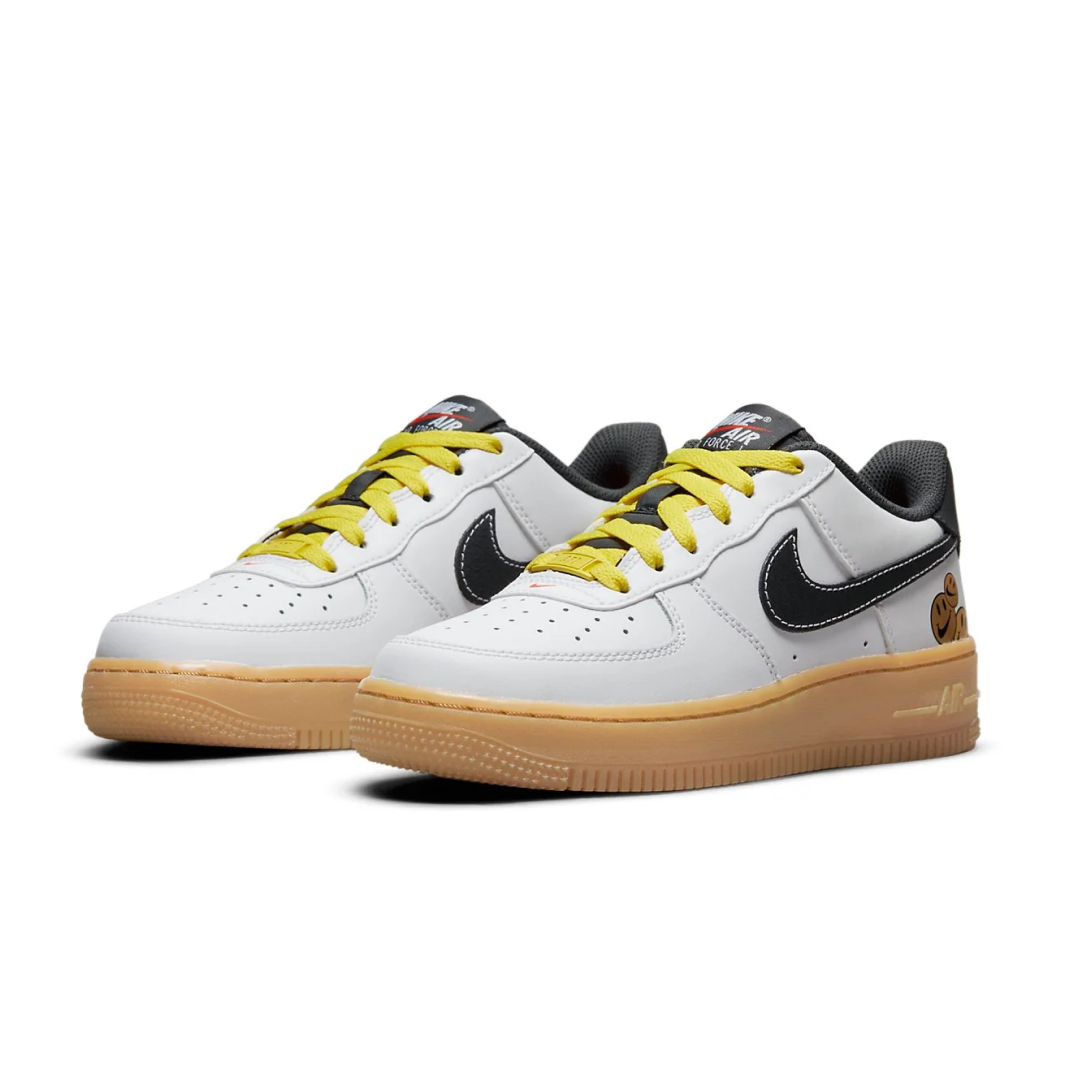 Детские кроссовки Air Force 1 LV8 'Go the Extra Smile' сочетают классический белый кожаный верх с яркими акцентами (Yellow Strike) и улыбающимися графическими элементами, создавая позитивный образ, а прочная резиновая подошва Gum обеспечивает комфорт и уверенное сцепление для самых активных фанатов Jordan.