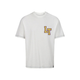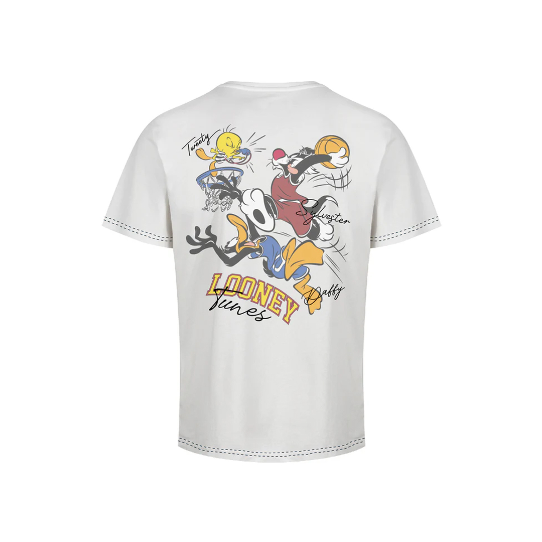 Мужская футболка RE:COVERED X LOONEY TUNES с принтом "Баскетбол", хлопковый круглый вырез, экрю-белая. Стильная мужская футболка от RE:COVERED в коллаборации с LOONEY TUNES, имеет большой принт на спине и логотип спереди, обеспечивает комфортную посадку, с короткими рукавами и круглым вырезом горловины, удобна в носке благодаря высококачественному хлопку.