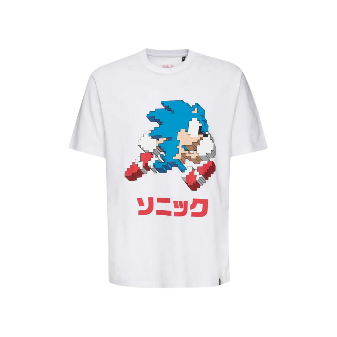 Мужская футболка RE:COVERED X SEGA с принтом Sonic, хлопковый круглый вырез, белая: Стильная мужская футболка от RE:COVERED в коллаборации с SEGA, имеет большой принт с Соником (Sonic) на груди, короткие рукава и круглый вырез, обеспечивает комфортную посадку и удобна в носке благодаря высококачественному материалу из 100% хлопка.