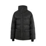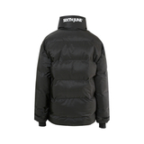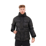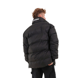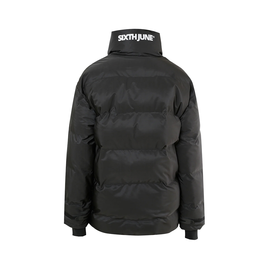 Мужской пуховик Sixth June: эффект стёжки, высокий воротник на липучке с надписью SIXTH JUNE на шее, два передних кармана с клапанами и магнитной застёжкой, внутренние карманы, манжеты в рубчик; центральная застёжка-молния и магнитные кнопки, боковая застёжка-молния; стандартный крой, чёрный цвет.